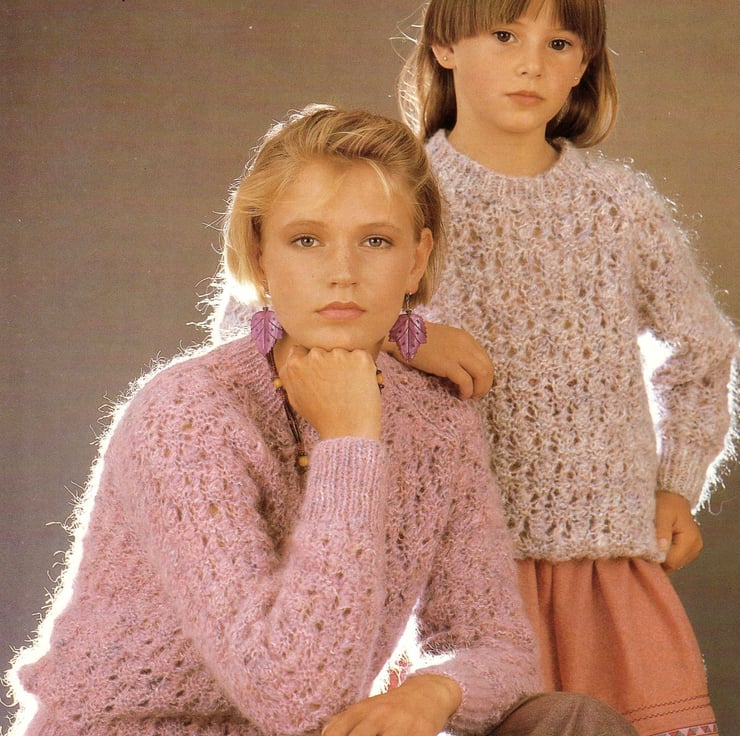 This comprehensive pattern’s range of bust/chest sizes means that it could be used for a ‘mother/daughter’ or ‘sister/sister’ combination of sweaters.