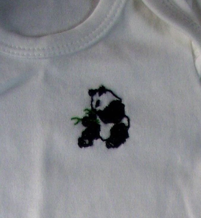 I have hand stitched a panda sitting eating bright green bamboo on the front of this delightful little white vest/onesie. The vest has an envelope neck, short sleeves and three press studs between the leg holes. It is 100% cotton and can be machine washed.