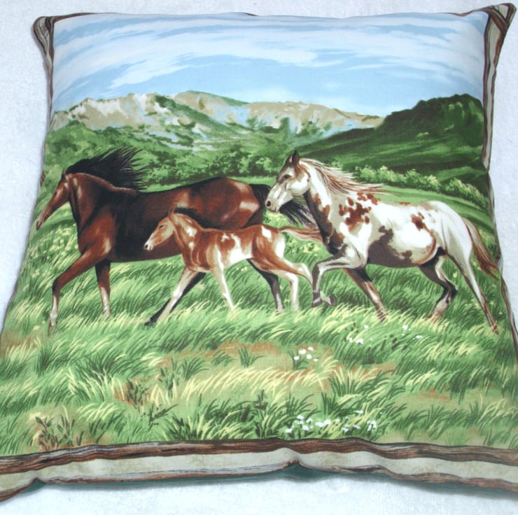 A square cushion with two horses and a foal trotting across a valley with mountains in the distance . would look good in any lounge, sitting room, study or office on any settee or armchair or in a conservatory or summer house or on a bed.