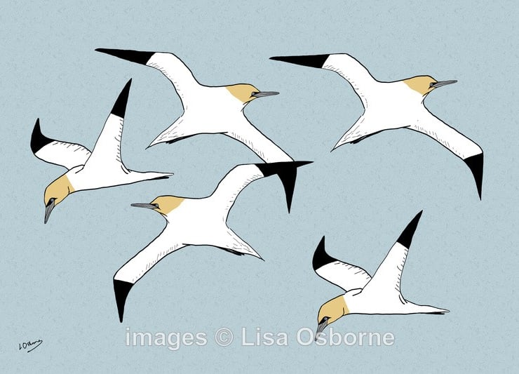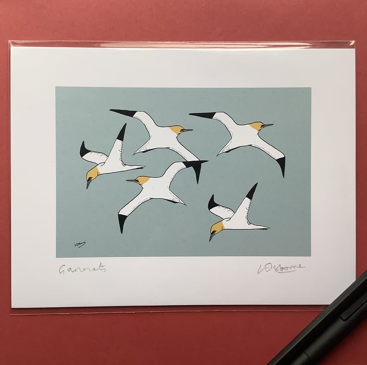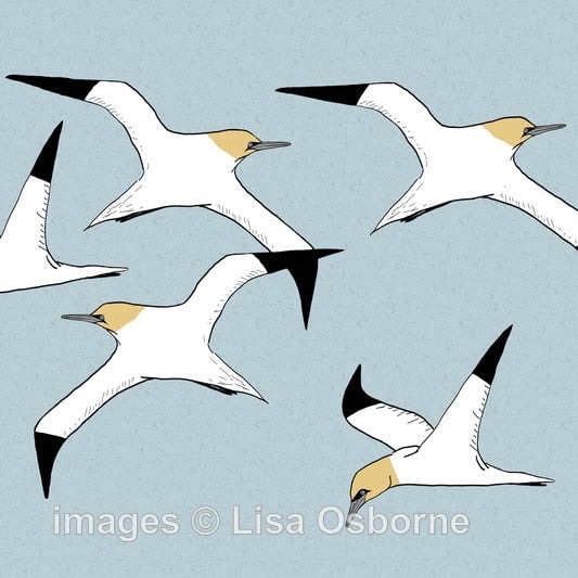 Gannets - colourful print of these birds frequently seen off our coastline.