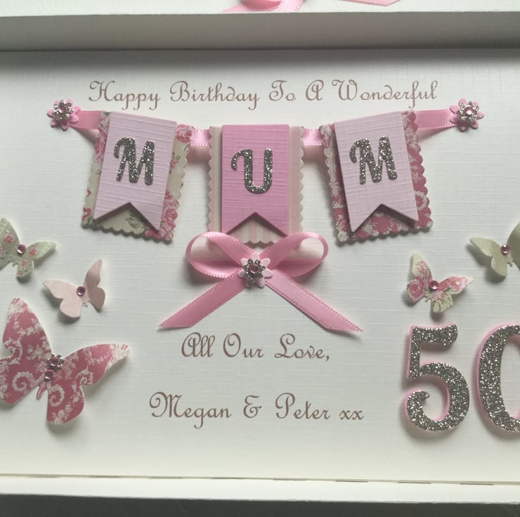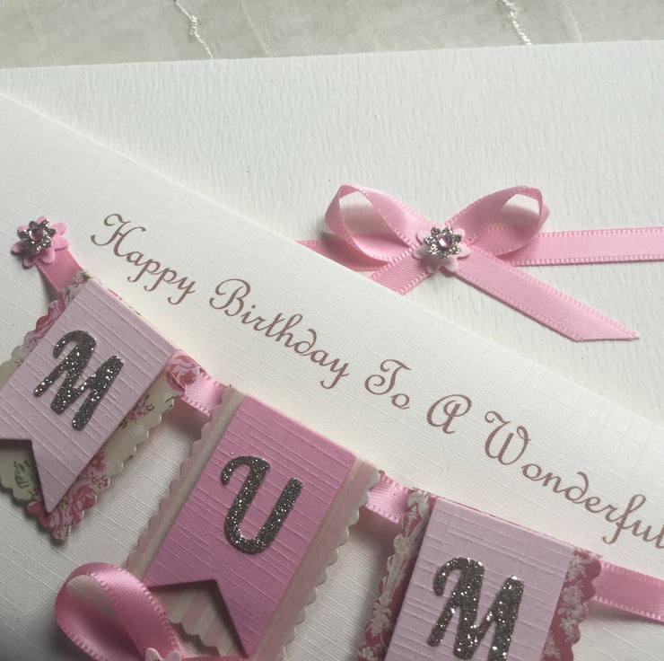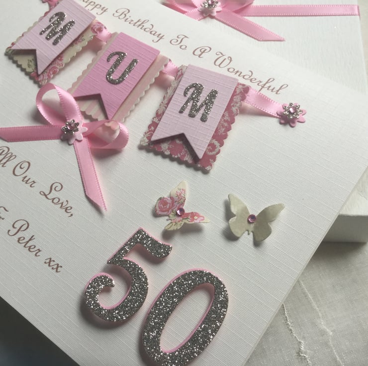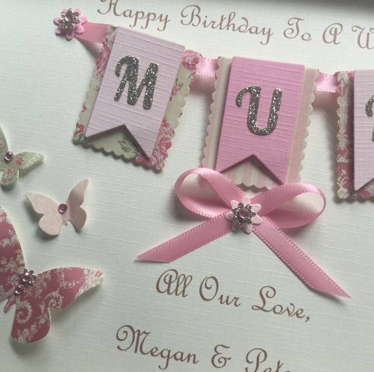 This handmade personalised card is A5 in size ( 210mm x 150mm) and is on 300gsm heavyweight linen cardstock. A name of up to seven letters can be made on the bunting. Or the bunting can have Mum, Mam, Mom or Sister. This card can be for any birthday or special occasion. Any age can be put on the card in large numbers or this can replaced with butterflies.