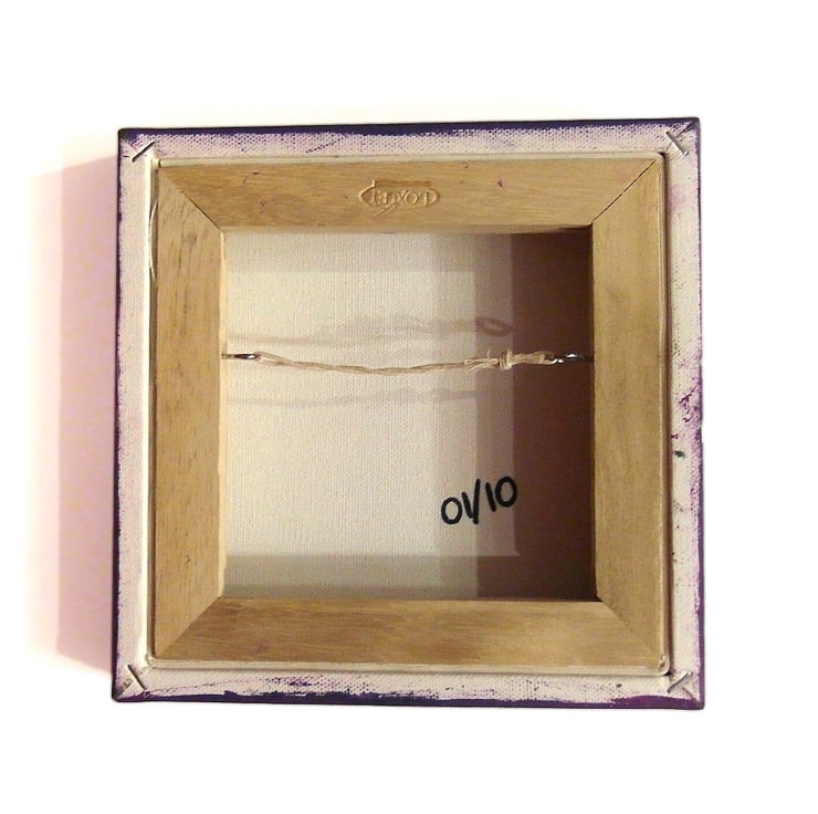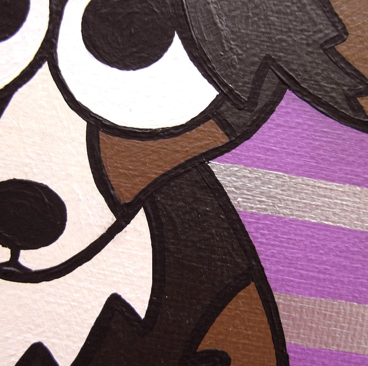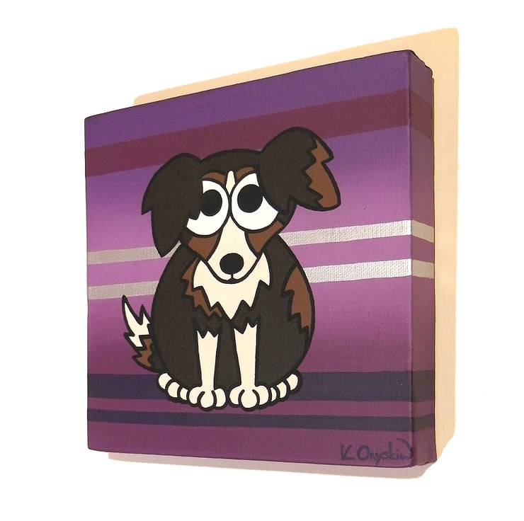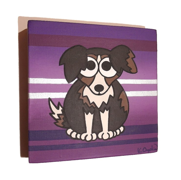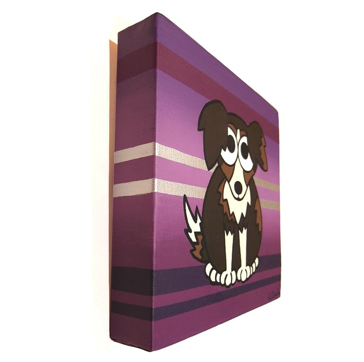 The cartoon dog art is painted in acrylics (with enamel for the silver), on a 20cm square canvas with 3.8cm deep edges (8" square with 1.5" edges) The stripes carry on over the edges of the canvas so there is no need for framing.