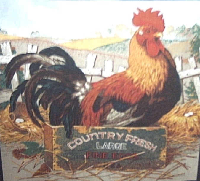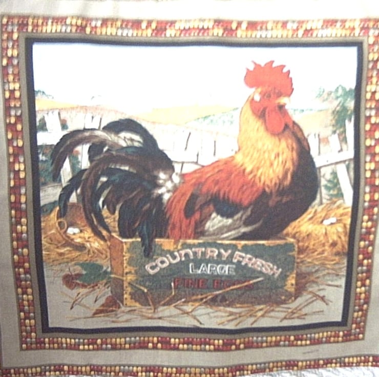 A square cushion with a Cockerel in a crate in a farmyard with eggs in an over turned basket and in the straw behind him, the crate has the words " Country Fresh Large fine Eggs" on the side. would look good in any lounge, sitting room, study or office on any settee or armchair or in a conservatory or summer house or on a bed.