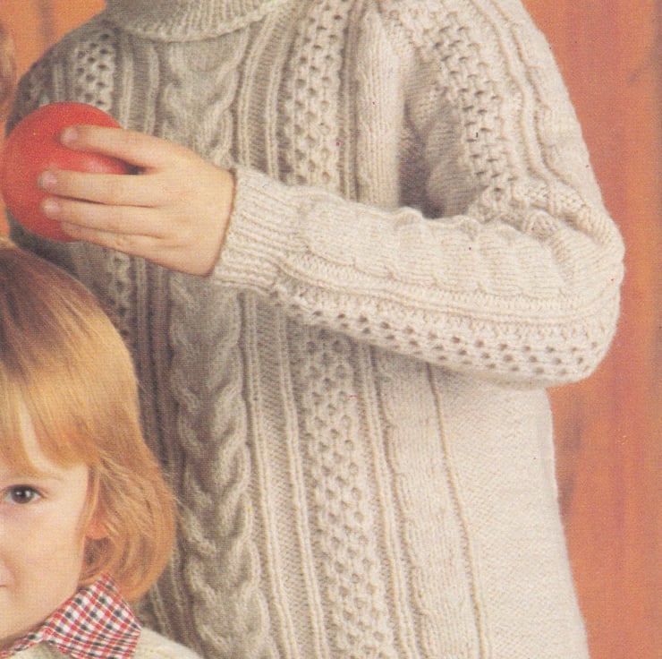 Here is a pattern for three beautiful, highly decorated sweaters in the Aran style.