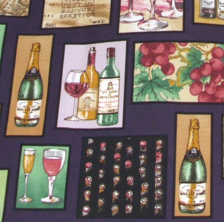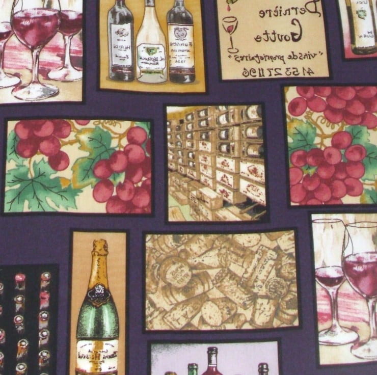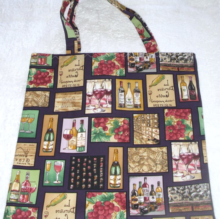 in the Wine cellar cloth shopping bag with pictures of rows of wine, wine labels, views of a wine cellar. bunches of grapes, on a wine red background. very comfortable to carry with cloth shoulder straps , ideal for carrying shopping or craftwork in .also useful as an overnight bag for all those essential items or as hand luggage when travelling , will hold for example : a wash bag , make up bag , slippers , a book , even clothing . it measures approx 42cm x 43cm