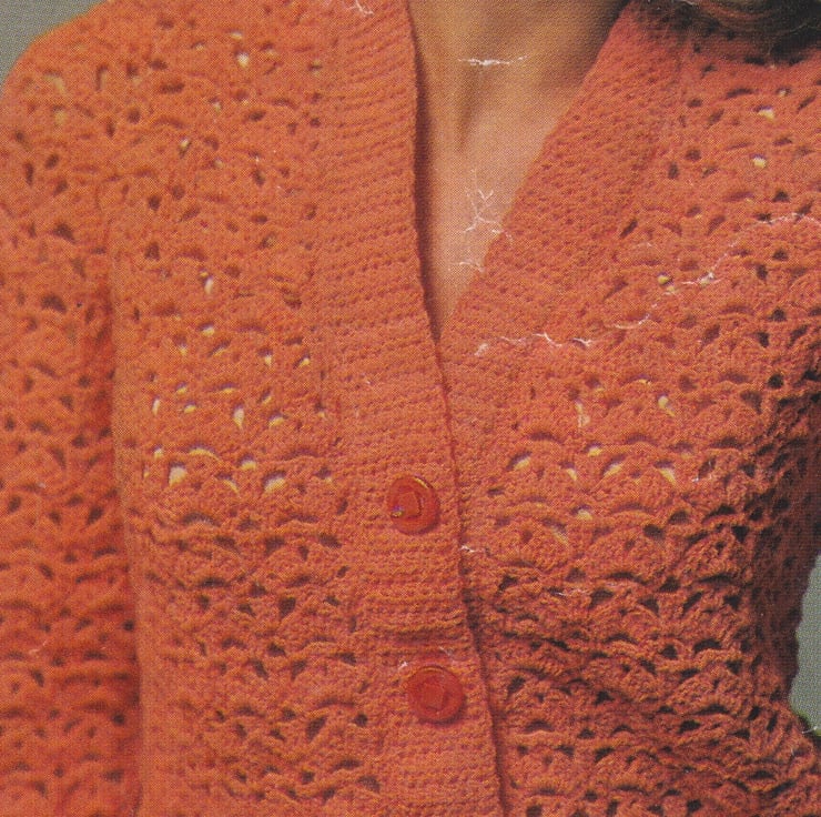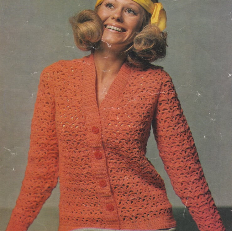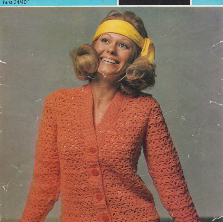 As you can probably tell from the photo – this pattern has seen a lot of life. (Yes, there will be a discount because of that). OK, so how many clues tell you it’s from the 1970’s? The orange colour? The yellow headband which is holding down her incredibly large curly hair? The suggested use of crepe or nylon yarn? (By the time you put this cardigan on and walk to the front door you would have attracted all the soft furnishings in your house, together with the balloons belonging to the kid up the road, to stick to you.