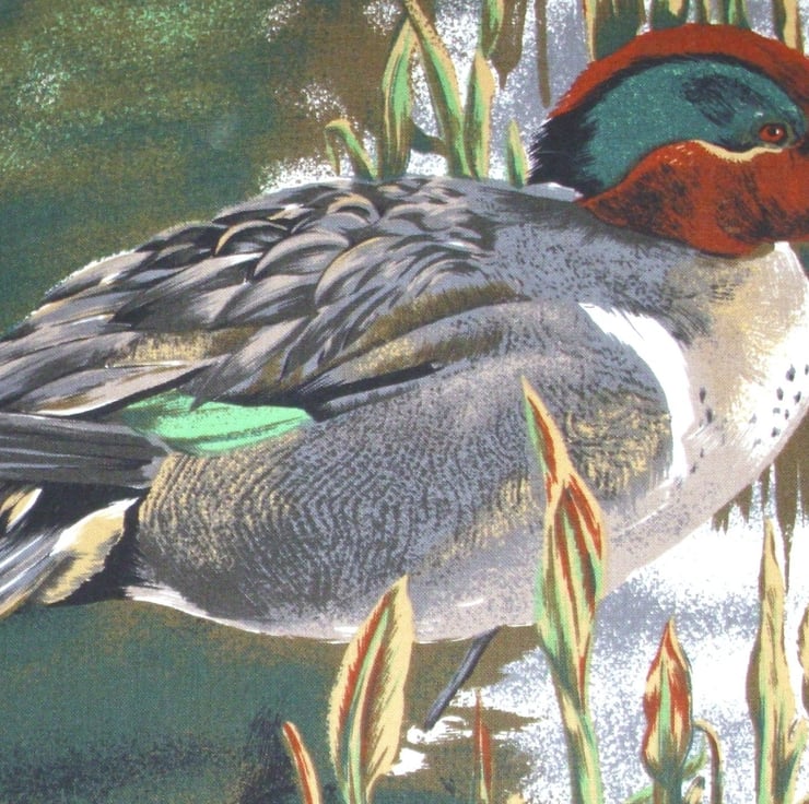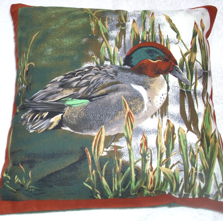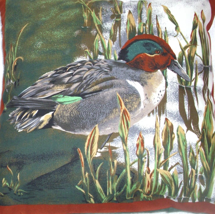 A lovely cushion of a duck standing peacefully by the waters edge , lovely and soft cushion, would look good in any lounge, sitting room, study or office on any settee or armchair or in a conservatory or summer house or on a bed.