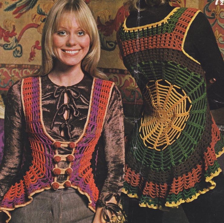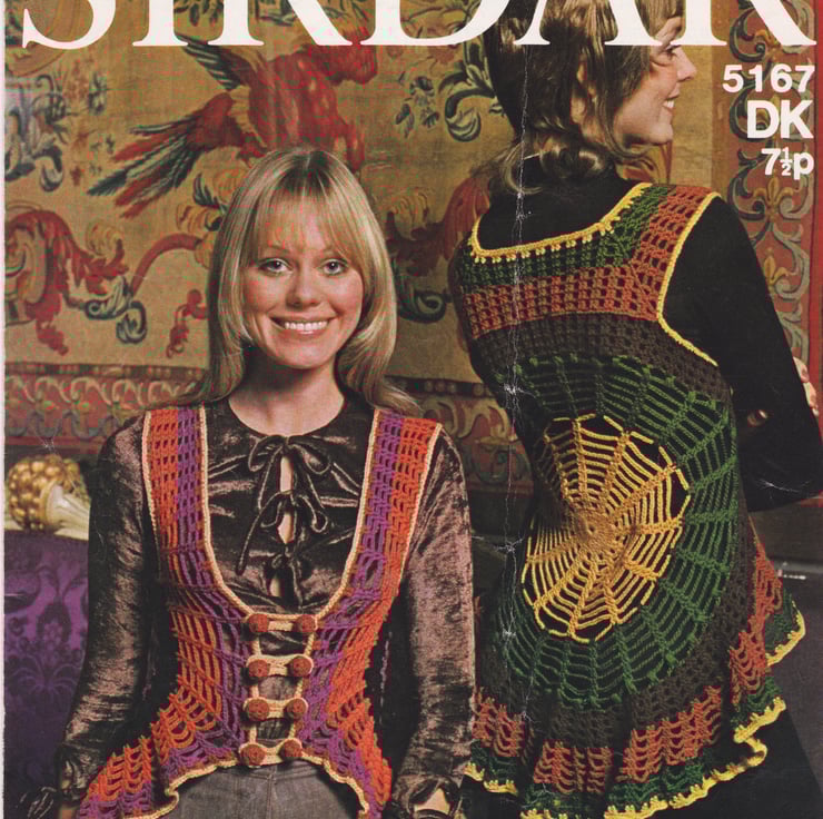Someone once called the 70’s ‘the decade that style forgot’. Rubbish! That person couldn’t have lived through that time and said that. From the birth of the monochrome age of the mini skirt (cheers, Mary!) in the 60’s to colour coordinated tights with your jumpers in the 70’s, these vests were staples of the ‘week-end’ hippie (Yup! I was one!). Together with the ‘granny square’ pull-over vests, the bright clashing colours were the go-to styles of those of us who lived in grey suits and skirts at the office during the week. Thankfully, I had a granny who could crochet, and a mum who could knit.