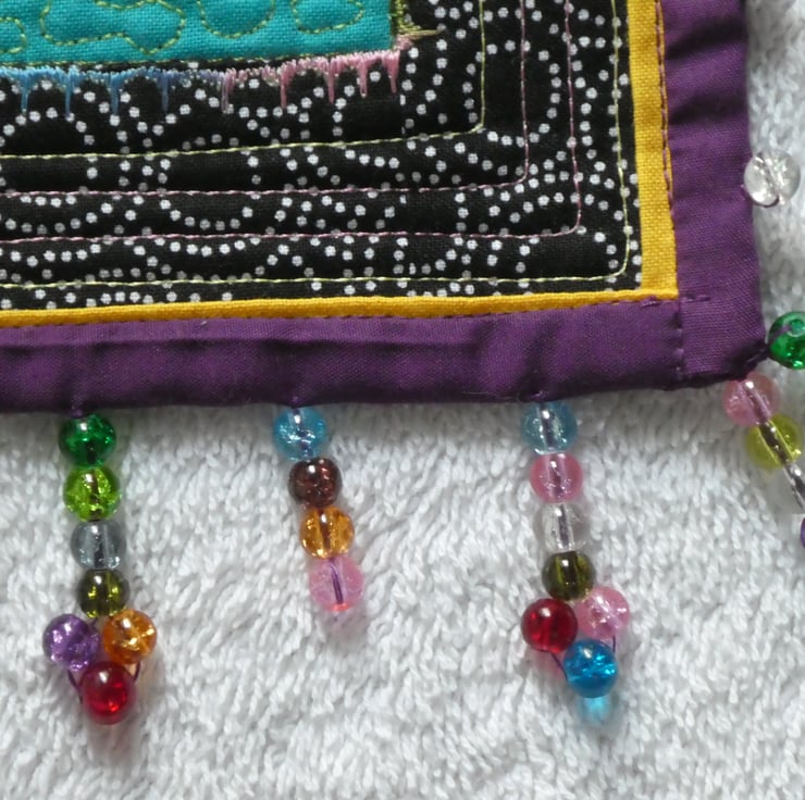 I have designed and created this fabulous small wall hanging from cotton fabric, with a hand sewn bead trim.