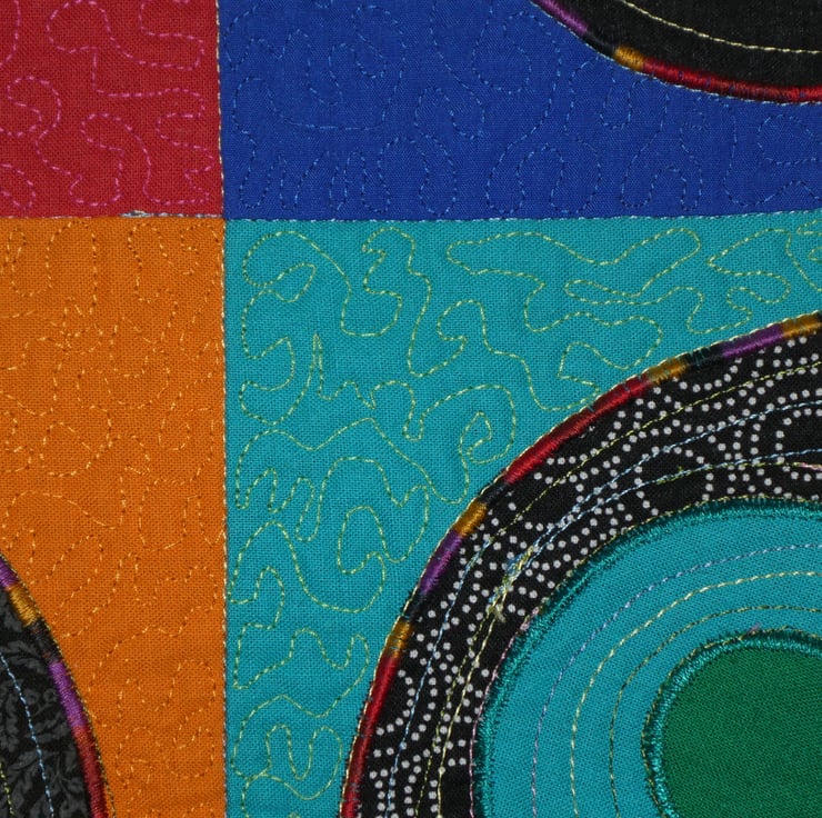 The background of the quilt is created from patchwork pieces, that have then had applique circles machine embroidered into place. The whole piece has then been densely quilted onto cotton wadding, with a variegated thread, before a double boarder has been added. To complete, the decorated beads have been hand stitched to the edge.