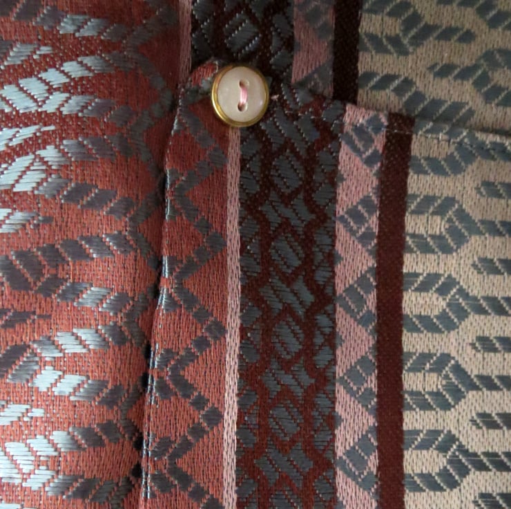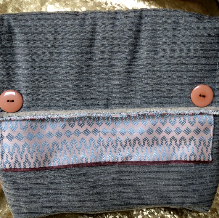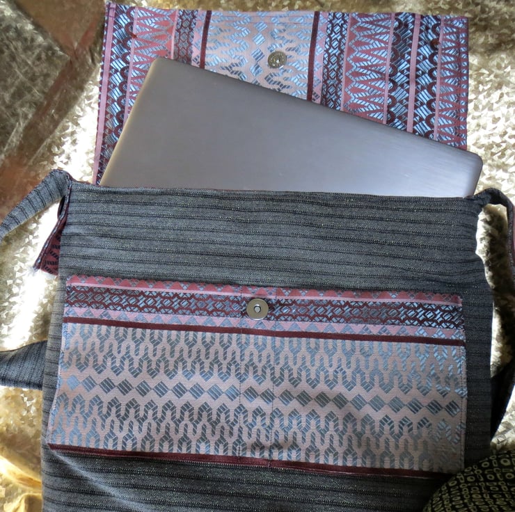 Handmade from a grey herringbone fabric shot through with gold thread, this laptop bag can bring a bit of bling and glamour to your working day.Fully lined with purple and silver polyester satin and with an inner pocket for accessories or phone and a double front pocket, this little beauty has a large flap and fastens with a magnetic catch. The bag measures 37cm wide by 33cm and 6cm deep and lightly padded for a squishy feel. There is a 98cm long by 5cm wide shoulder strap for comfortable wear.The look is completed with two large tan buttons on the front flap.