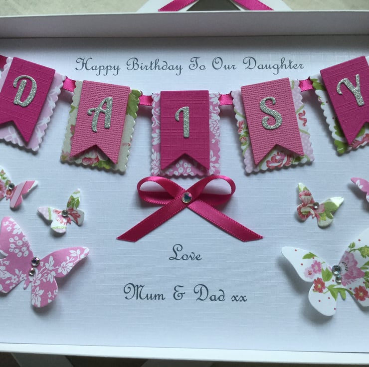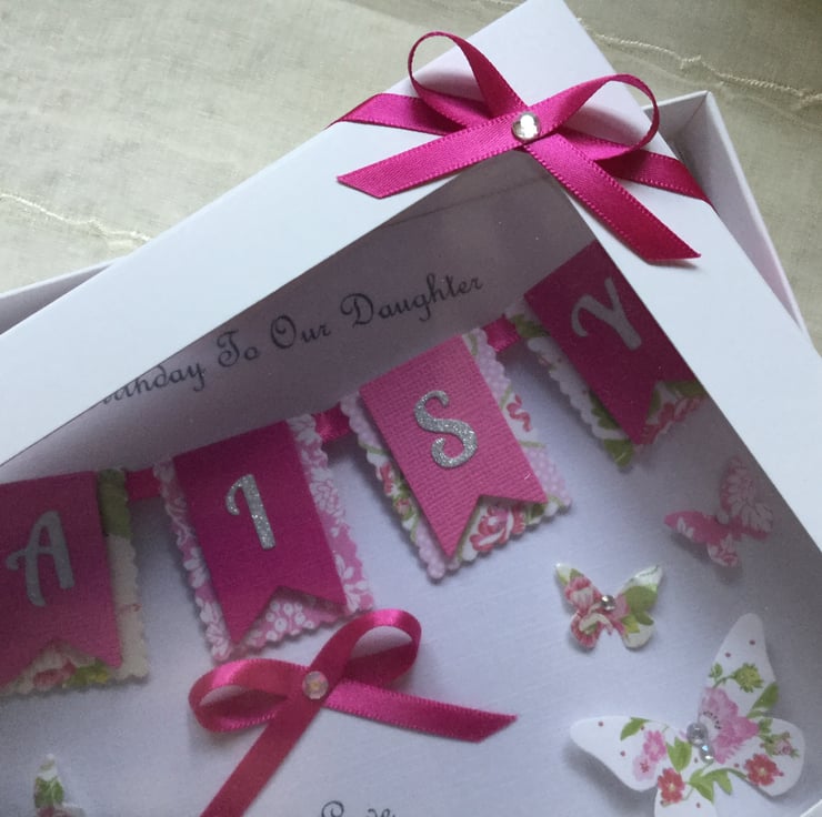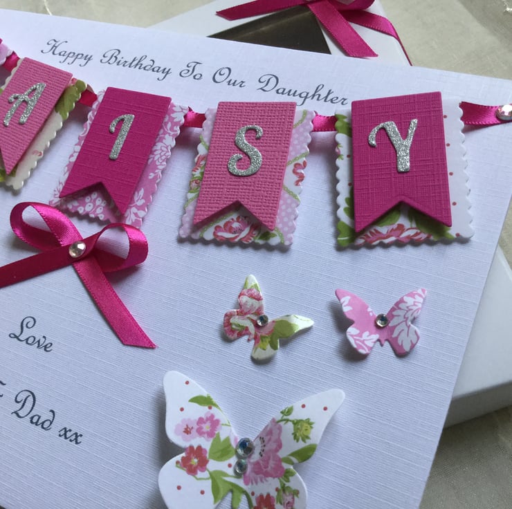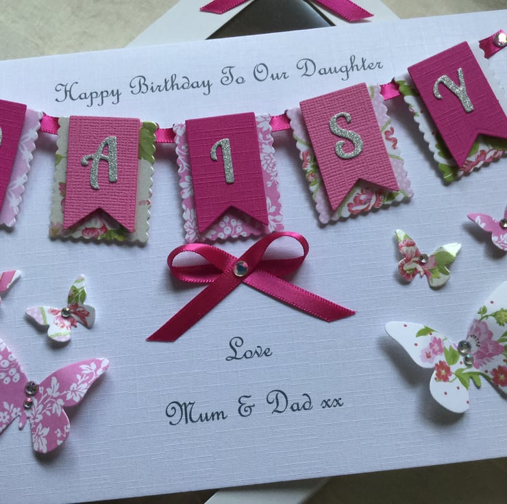 This handmade personalised card is A5 in size ( 210mm x 150mm) and is on 300gsm heavyweight linen cardstock. A name of up to seven letters can be made on the bunting. This card can be for any birthday or special occasion. Any text can be added above and below the bunting.