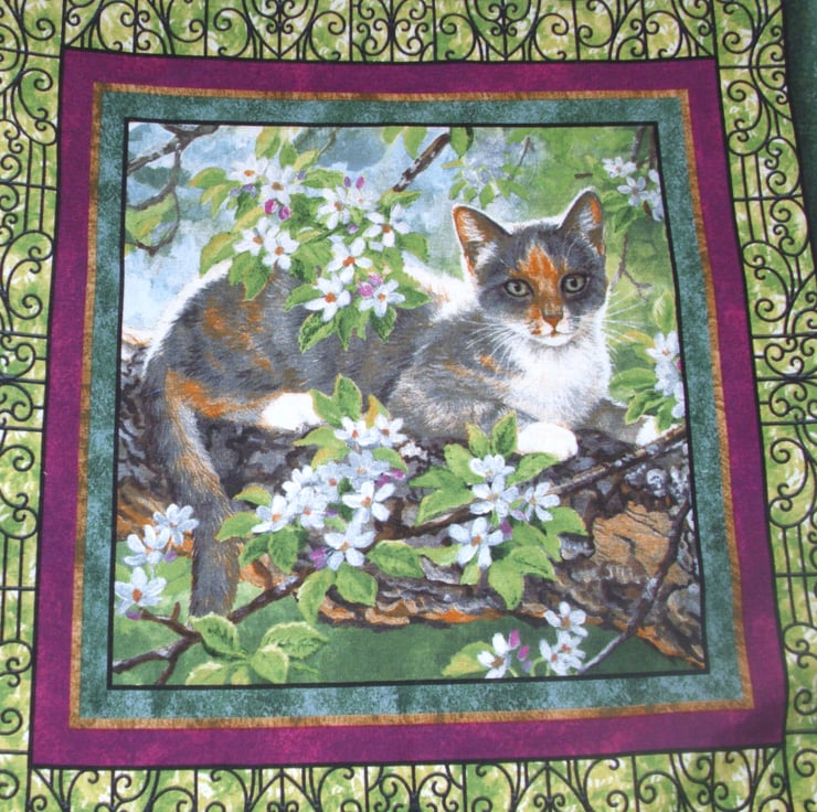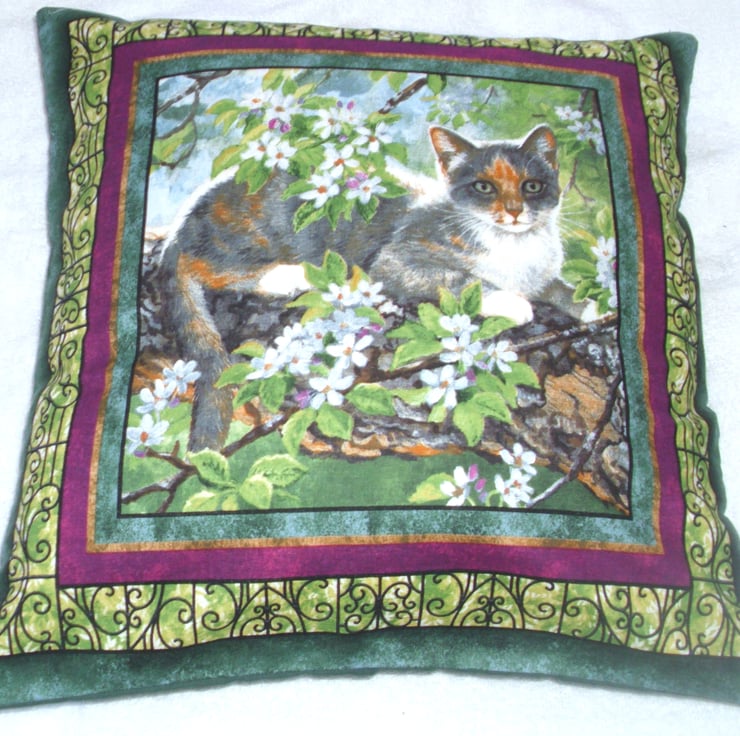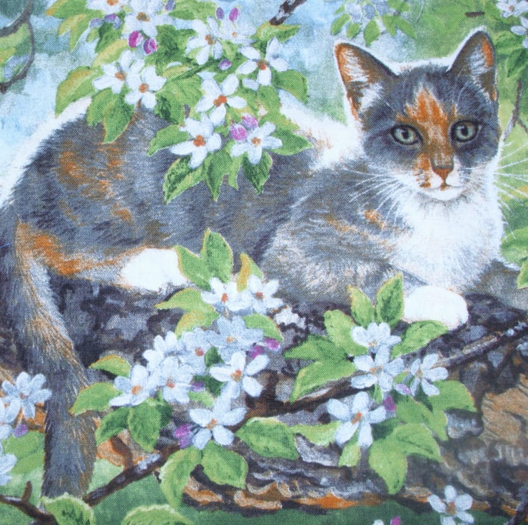 Pretty ginger, grey and white kitten sitting up in an apple tree cushion . lovely and soft cushion ,would look good in any lounge, sitting room, study or office on any settee or armchair or in a conservatory or summer house or on a bed.