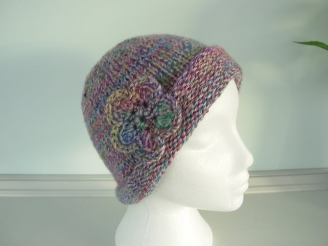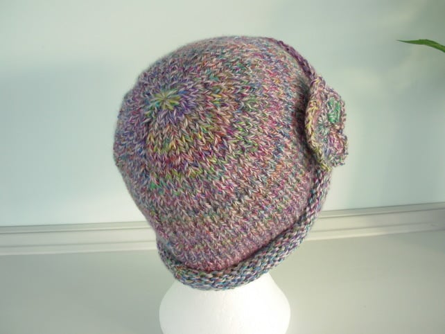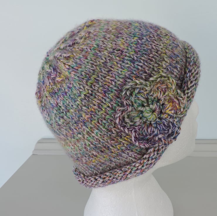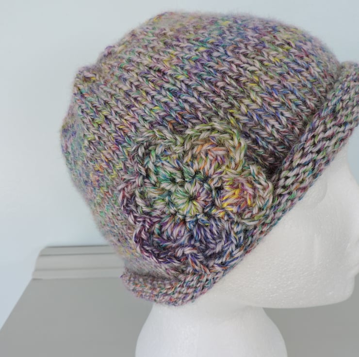 This cosy adults beanie hat has been knitted with Wendy Festival chunky acrylic yarn and finished it with a crochet flower on the side. The colour is called T in the Park and is a marl yarn of oatmeal, purple, green, yellow and pink.