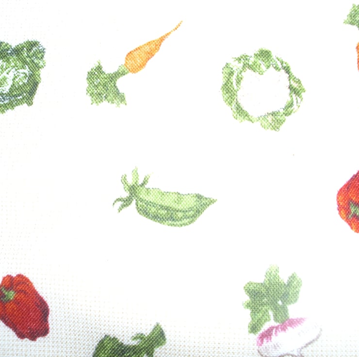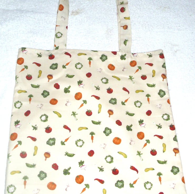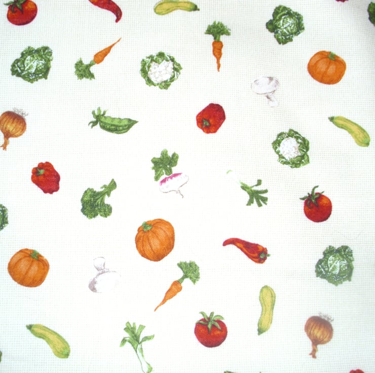 Tossed Vegetables cloth shopping bag With Carrots, cauliflowers, Cabbages, Mushrooms, Pumpkins, Red Peppers, Onions, Swede, Broccoli and marrows, all tossed on a cream check background , very comfortable to carry with fabric handles , ideal for carrying shopping .also useful as an overnight bag for all those essential items or as hand luggage when travelling , will hold for example : a wash bag , make up bag , a book . it measures approx42.5 cm x 40cm .