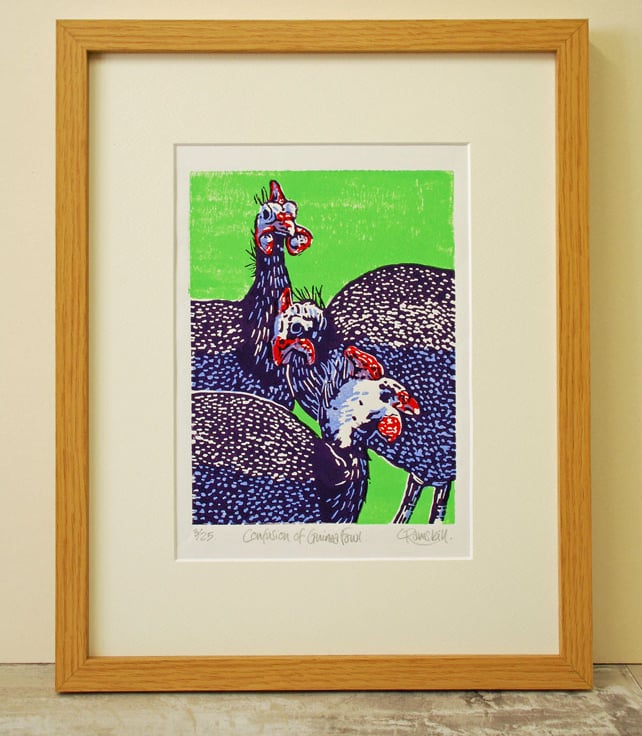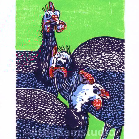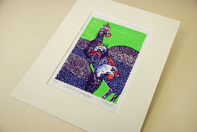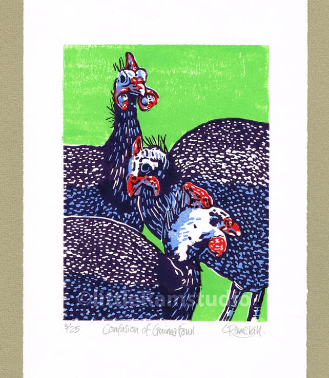 'Confusion of Guinea Fowl' - Original, hand pulled Linocut Print, printed on hand press, in 4 colours. Limited edition of 25 (plus 2 artist proofs)