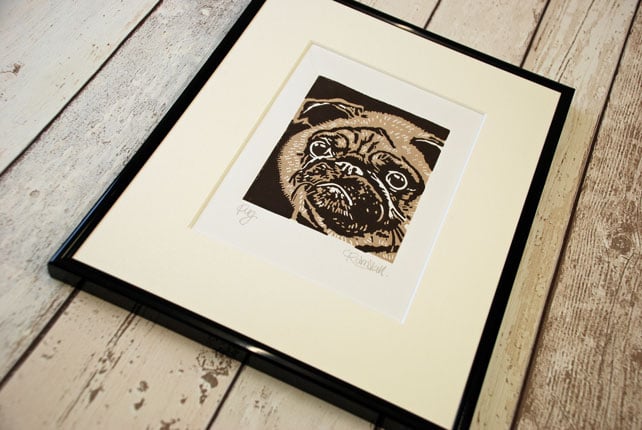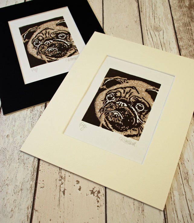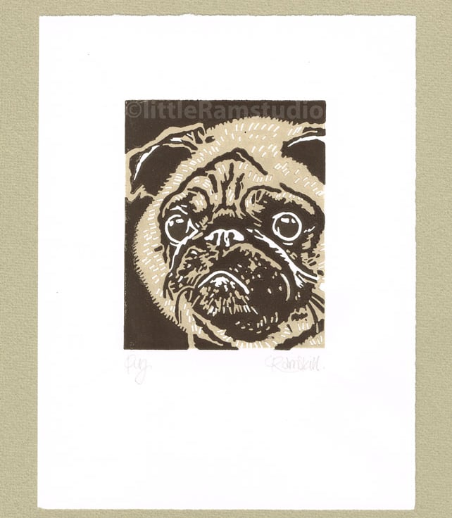 'Pug Dog' - Original, hand pulled Linocut Print, printed on hand press, in dark brown and soft brown inks. Signed and titled in pencil by the artist.