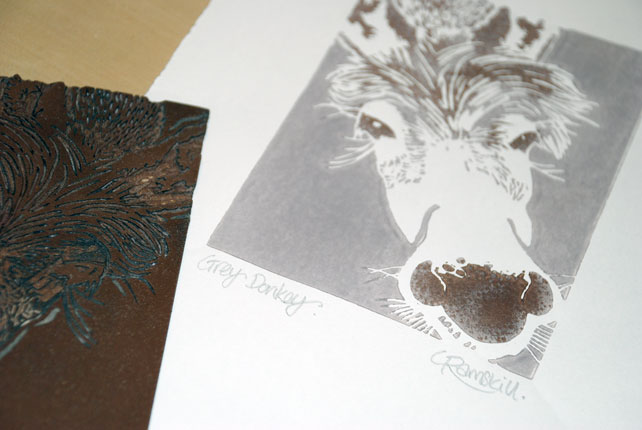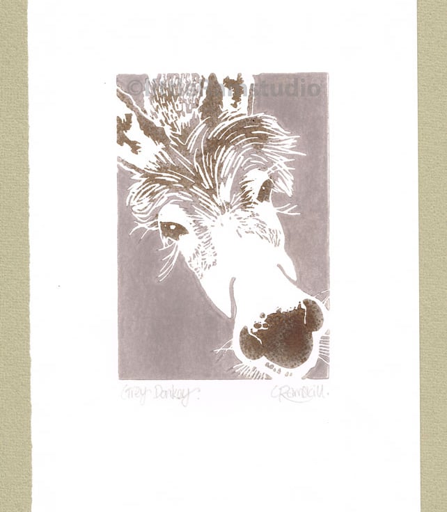 Available printed in donkey grey and hand embellished directly on the linoplate with a darker tone.
