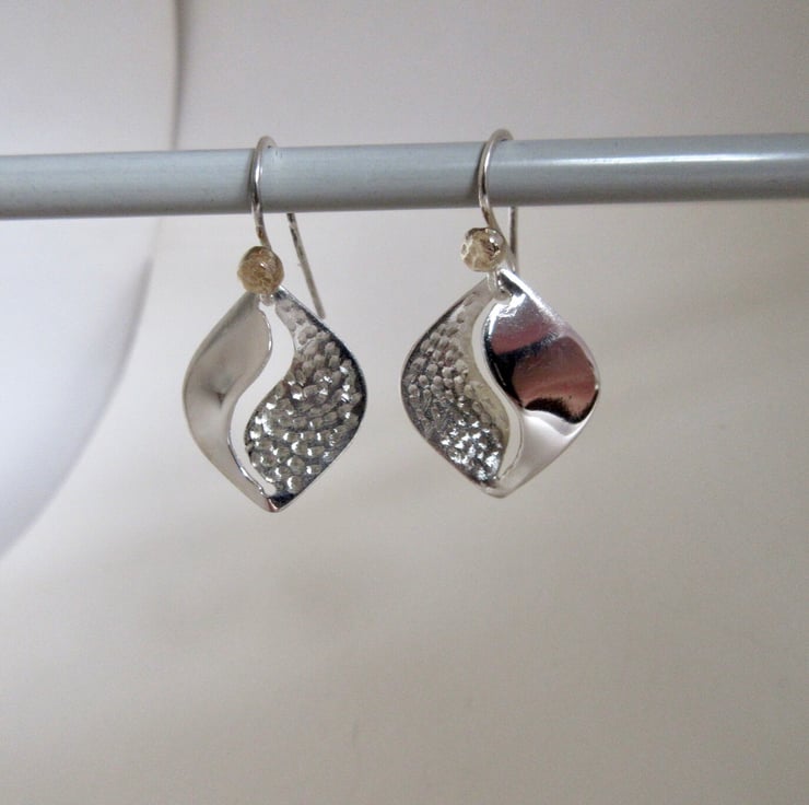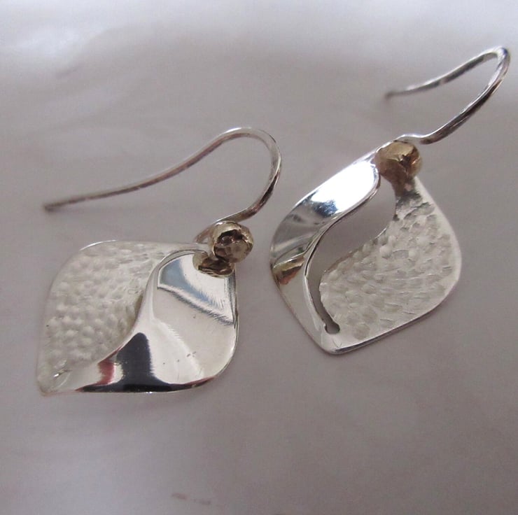 Handcrafted rounded squares of sterling silver feature a combination of a textured and highly polished finish on both front and back, pierced and gently curved to add body and catch the light. The earrings are hung from handmade ear wires with a hammered 9ct gold ball.