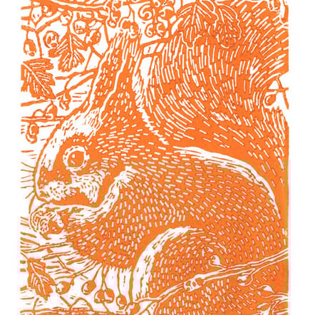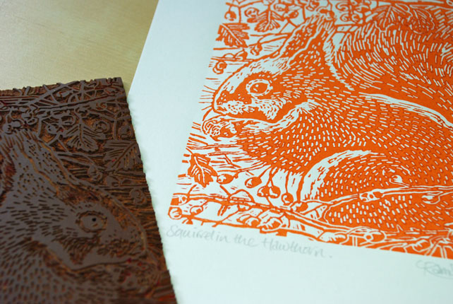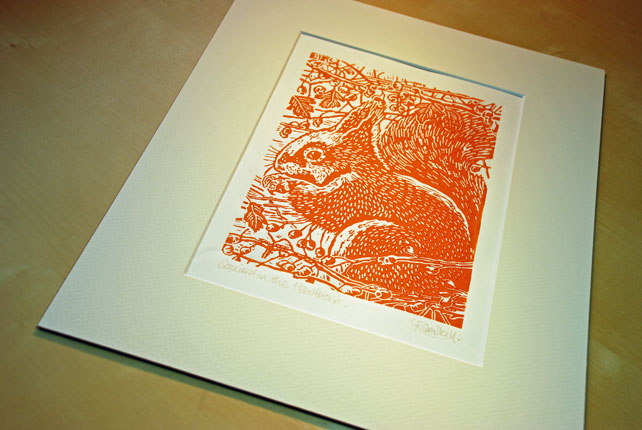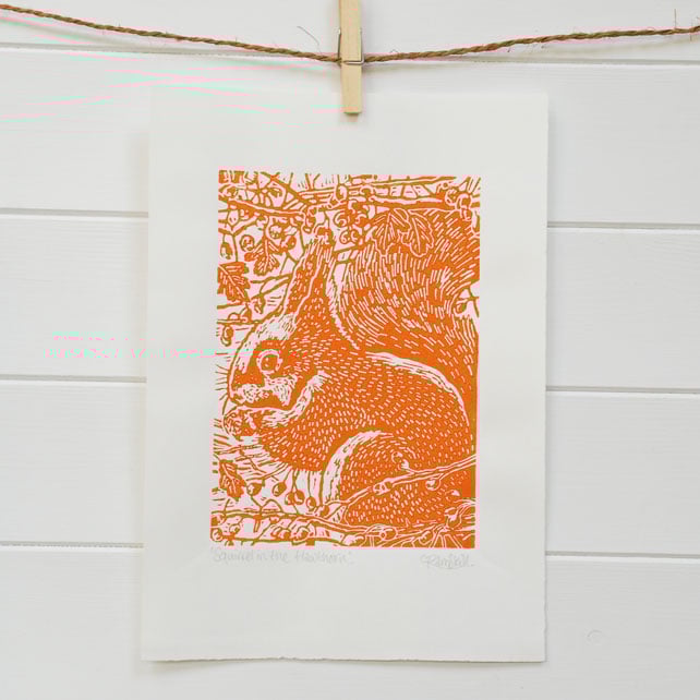 Squirrel in the Hawthorn - Original, hand pulled Linocut Print, printed on hand press, available in burnt orange ink. Supplied in a cream mount, all you need is a frame!