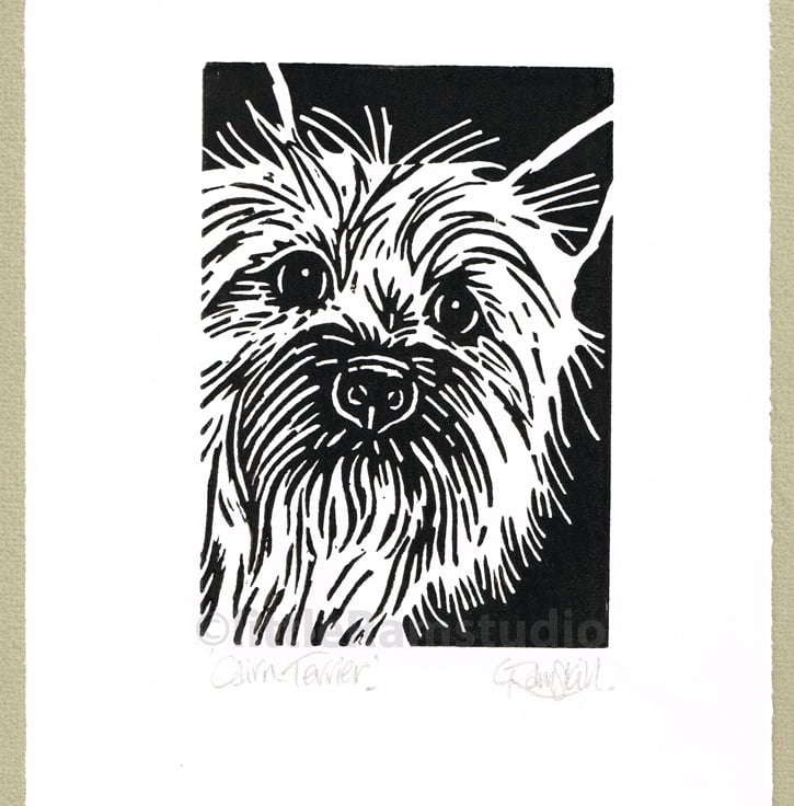 'Carin Terrier Dog' - Original, hand printed linocut, printed on hand press in brown ink. Signed and titled in pencil by the artist.