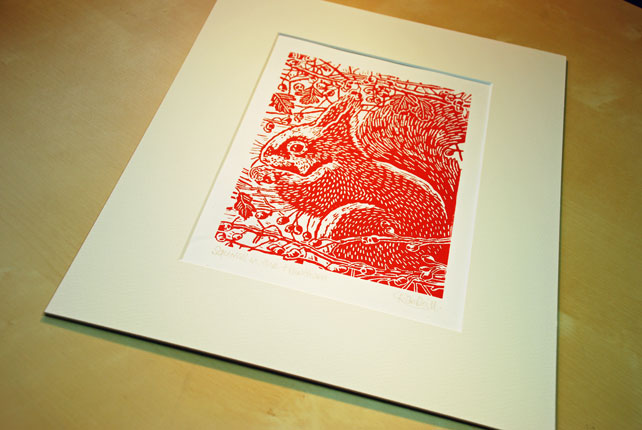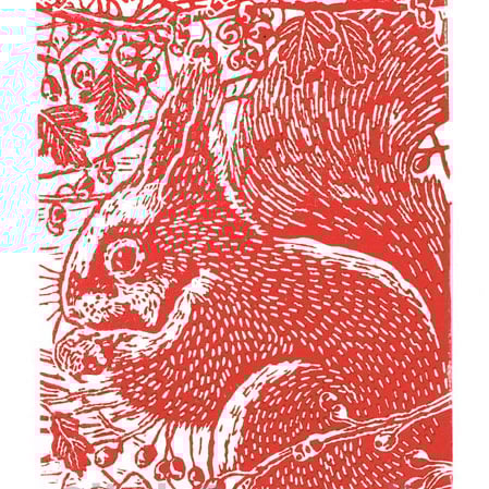 Squirrel in the Hawthorn - Original, hand pulled Linocut Print, printed on hand press, available in deep red ink. Supplied in a cream mount, all you need is a frame!