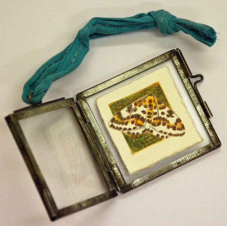 One inch high coloured pencil drawing of tiny Magpie Moth drawn to actual size with a wing span of 36mm. Supplied in 5cm zinc 'vintage style' frame.