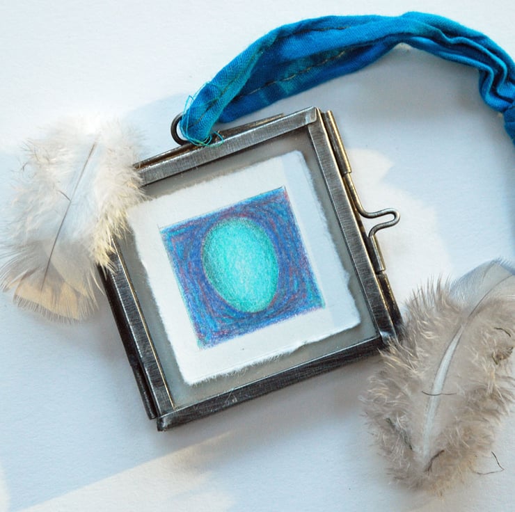 Frame is zinc and glass with hinged side and re-cycled sari fabric hanging ribbon.
