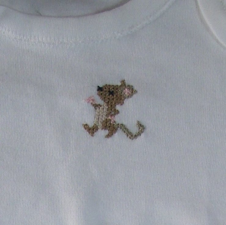 I love my friendly little brown mouse. I first designed him as one of the three blind mice on a shawl, but I liked him so much that I opened his eye and have stitched him many times since, on bibs, shirts, vests and towels.