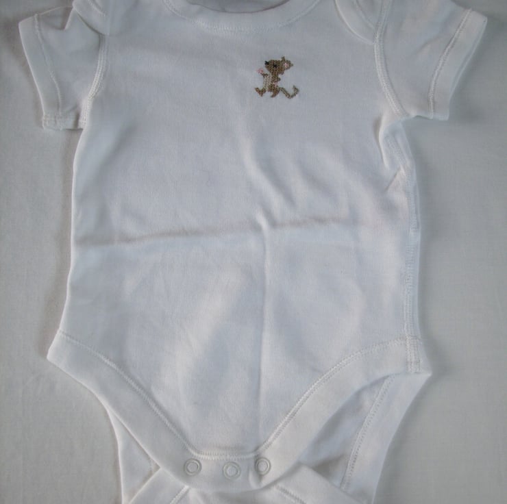 This is a sweet little white vest/onesie for a new baby. I have made it even more special by hand embroidering a brown mouse on the front. The vest has an envelope neck, short sleeves and three press studs between the leg openings. It is 100% cotton and can be machine washed.