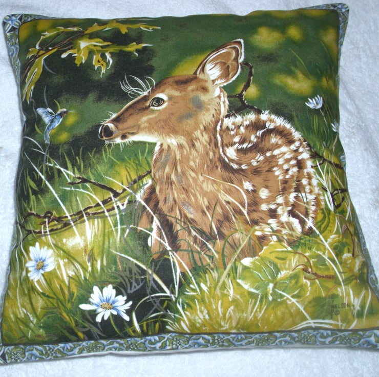 A square cushion with a fawn lying down in the long grass with a little bird hovering by her face. lovely and soft cushion ,would look good in any lounge, sitting room, study or office on any settee or armchair or in a conservatory or summer house or on a bed.