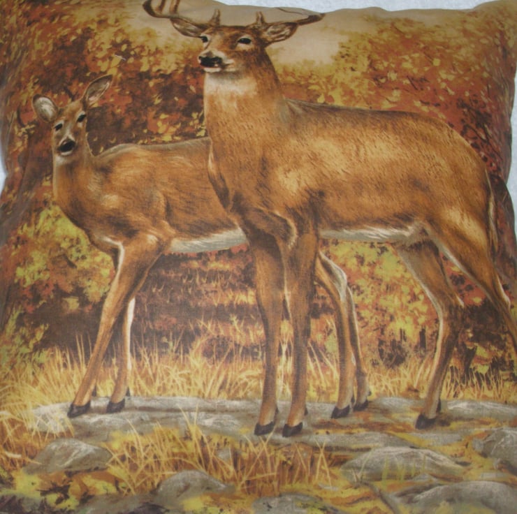 A square cushion with a deer and stag standing in a glade in an Autumnal wood. lovely and soft cushion ,would look good in any lounge, sitting room, study or office on any settee or armchair or in a conservatory or summer house or on a bed.