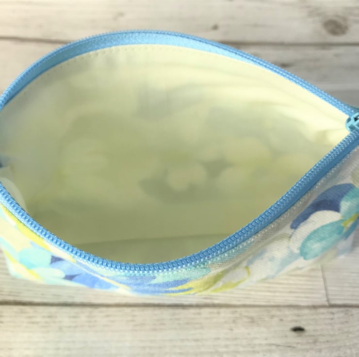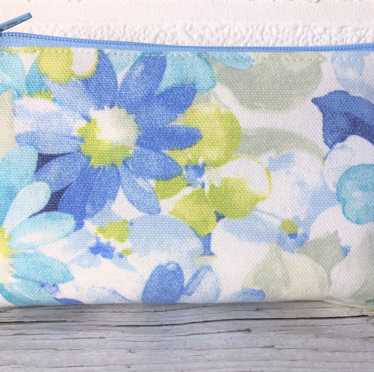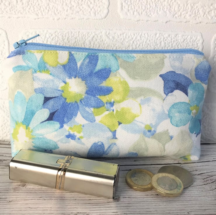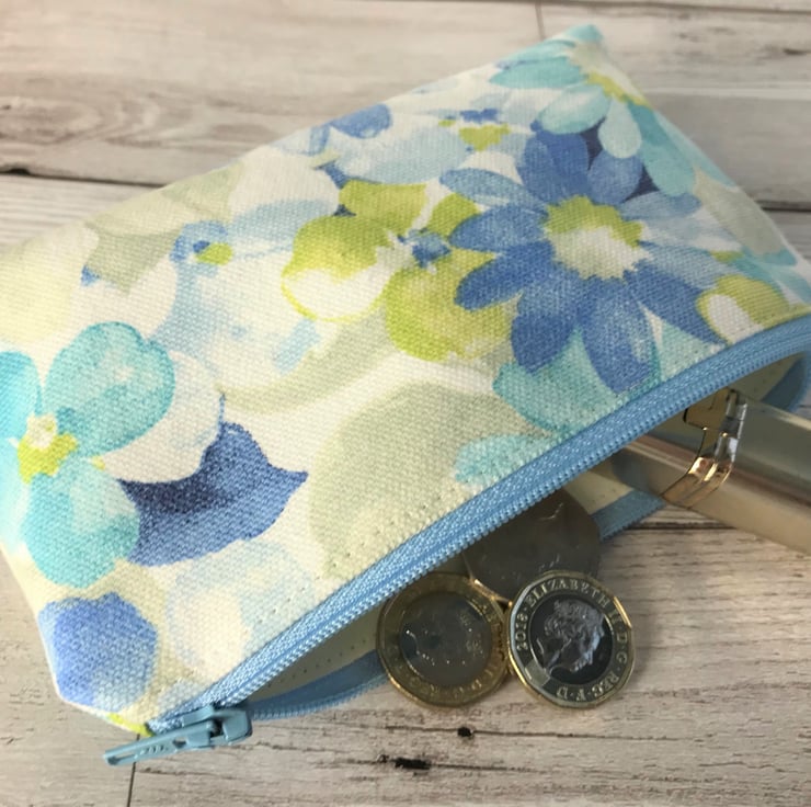 A large purse in summery fabric with a pretty floral print pattern in pastel shades of blue, turquoise, yellow-green and white. The coin purse has a matching pale blue zip and is lined with cream fabric. The base of the purse is boxed to give more space inside.