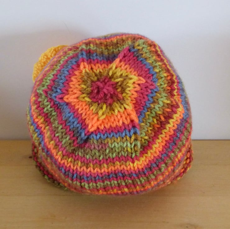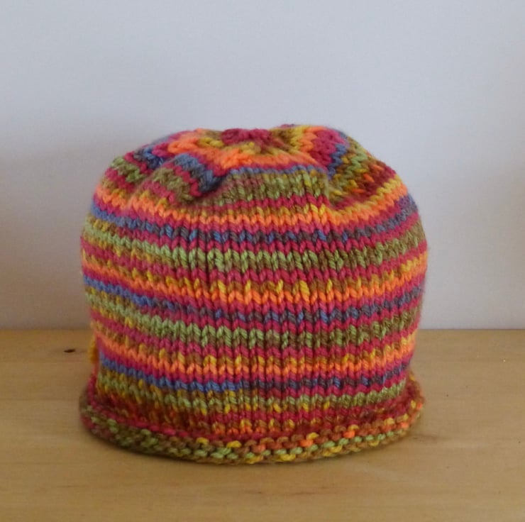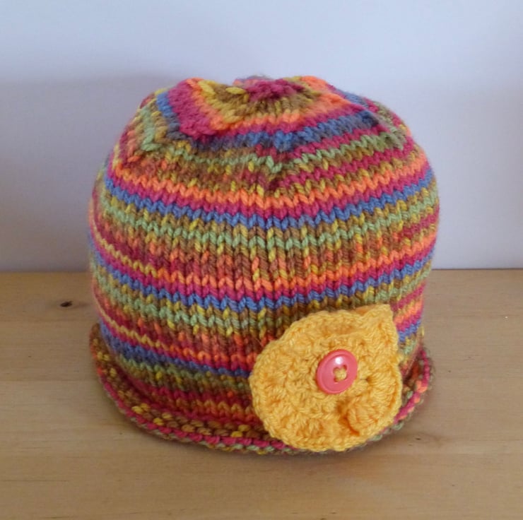 A hand knitted hat in a lovely bright self patterning 100% acrylic yarn. The colours include orange, pink, blue, green, brown and yellow. The hat measures approximately 16" around by 7" in depth, has a roll rim and is decorated with a co-ordinating crocheted flower and button. This item will be sent by Royal Mail packed to arrive safely. An ideal gift for a baby girl.
