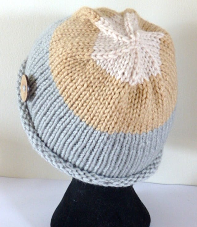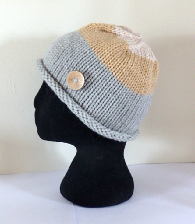 A hand knitted hat in a chunky 100% acrylic yarn in beach colours of blueish grey, sand and off white.The hat has an easy to wear roll rim is trimmed with a natural coconut shell button and measures approximately 19" around by 8" in depth. Knitted in the round so no seams this hat should fit an older child or small adults head. Soft and snug for a winter walk.