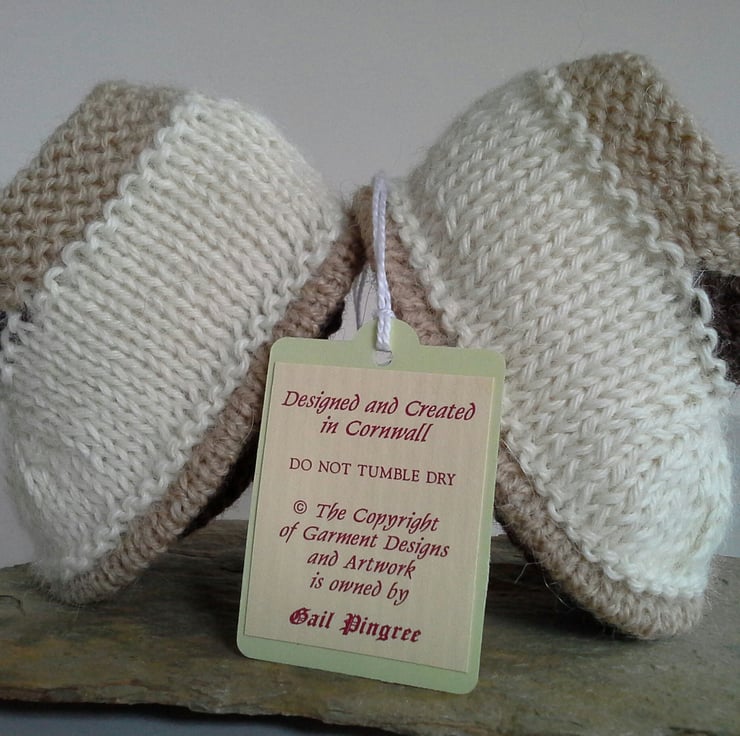 These are genuine designer products. They have not been reproduced from any commercially published knitting pattern. Please respect the designer's full time profession, skills and modest income for 2.75 hours of quality workmanship and materials used by not trying to replicate them. This includes using different colourways, stitch formations, yarns and any additional design trims.