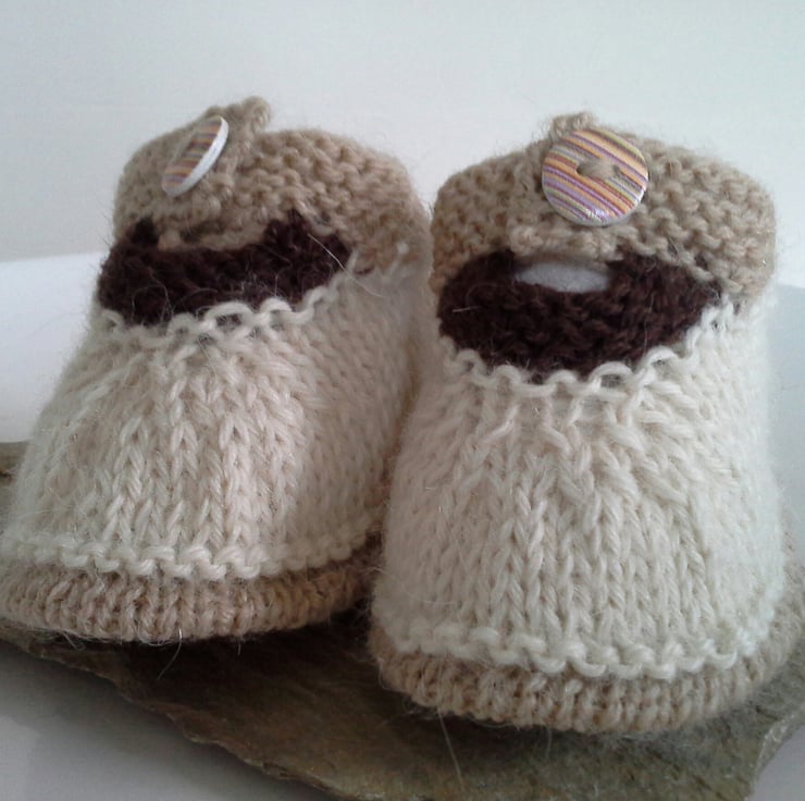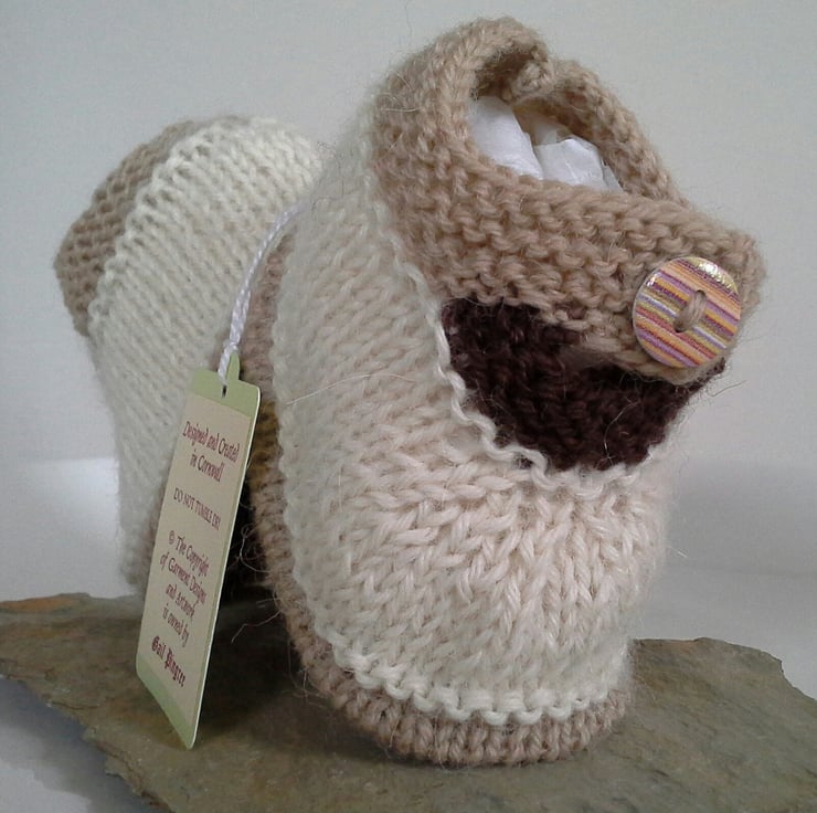 These sweet adorable looking baby shoes/booties have been designed and hand crafted using top quality branded designer 'baby alpaca' knitting yarns. They will make a perfect luxury token newborn or baby shower gift for parents whom appreciate and value quality products made from natural hypoallergenic materials for there new arrival. Each shoe is fastened in the centre front by genuine wooden buttons with a delicate stripe design on them.