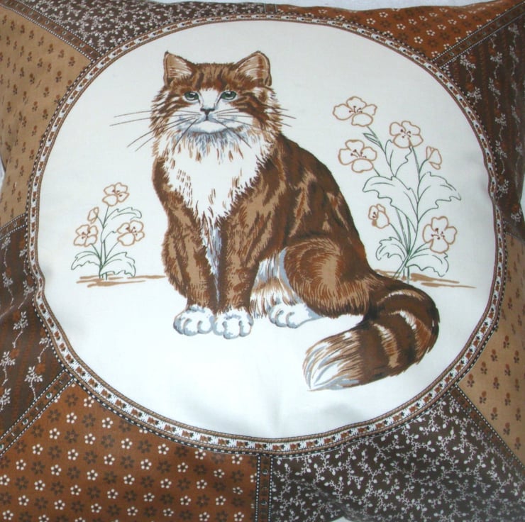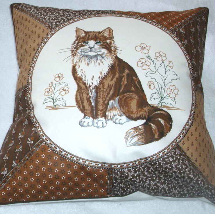 square cushion with a very pretty Brown and white fluffy cat sitting in the middle with a border of patterns in shades of brown patchwork style . lovely and soft cushion ,would look good in any lounge, sitting room, study or office on any settee or armchair or in a conservatory or summer house or on a bed.