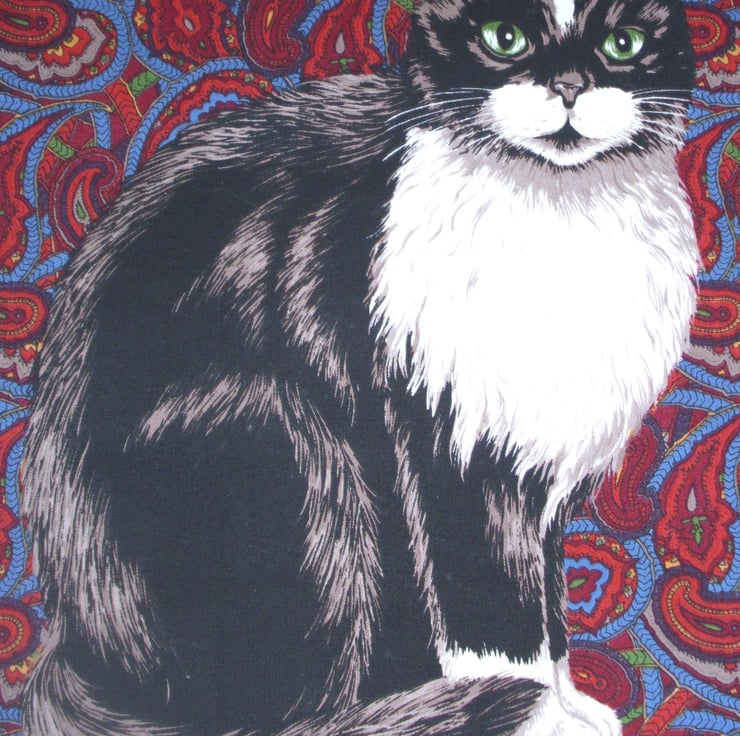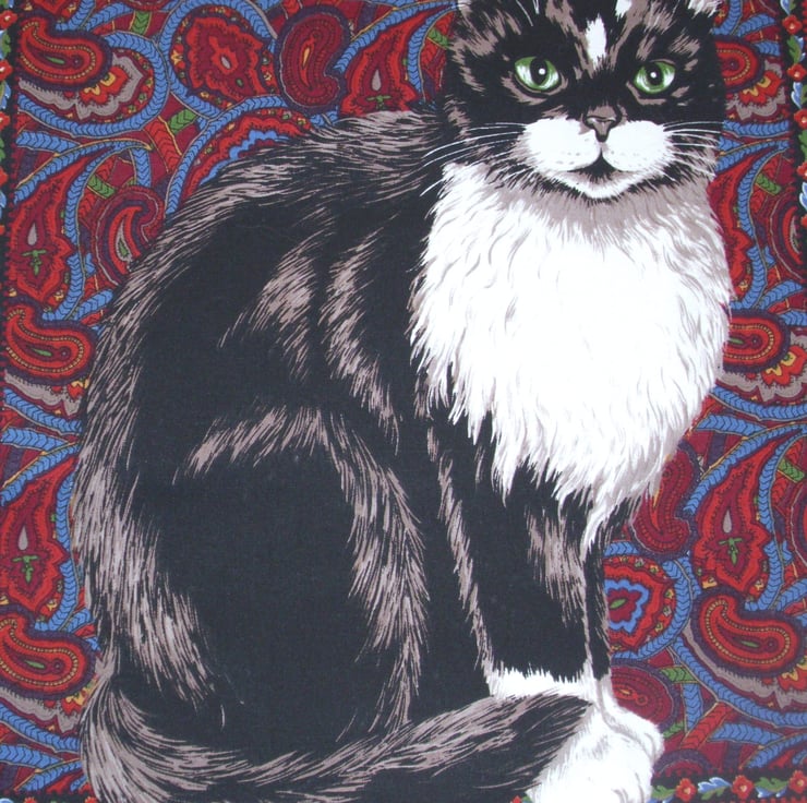 A square cushion with a beautiful black and white cat with green eyes sitting upright on a red and blue tapestry rug. lovely and soft cushion ,would look good in any lounge, sitting room, study or office on any settee or armchair or in a conservatory or summer house or on a bed.