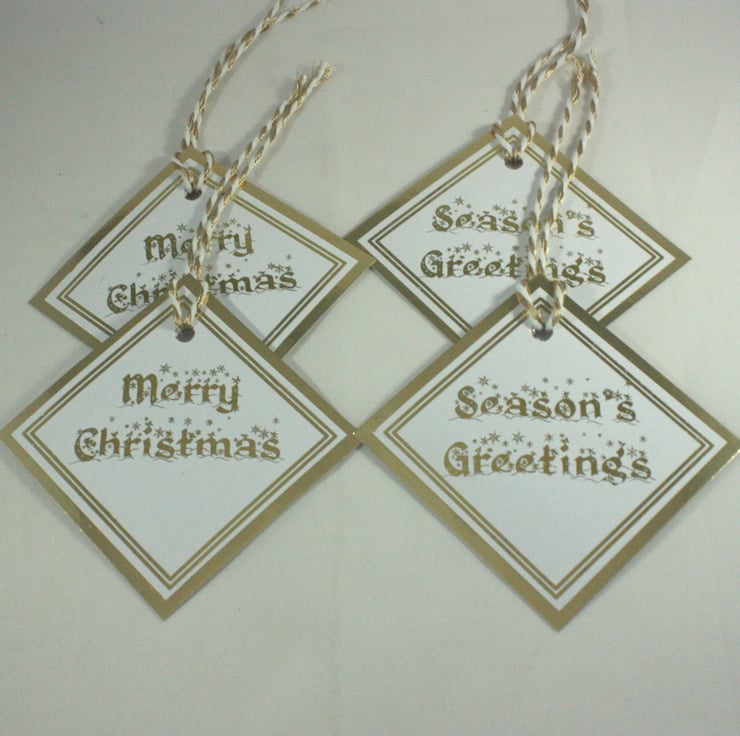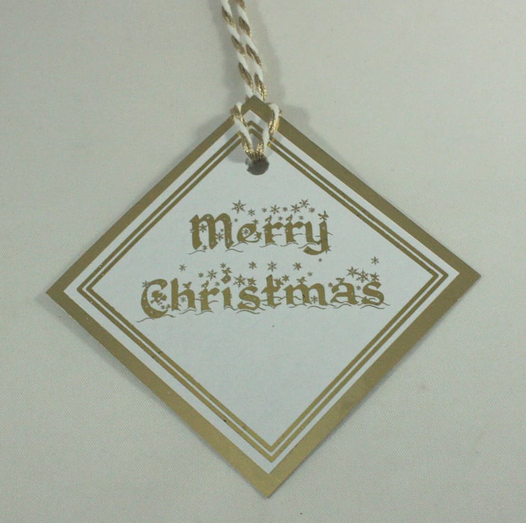 Each tag measures approximately 3" (7.5cm) square and comes with gold and white baker's twine to attach to your gifts.