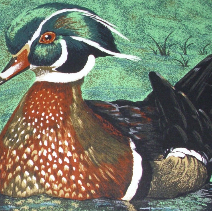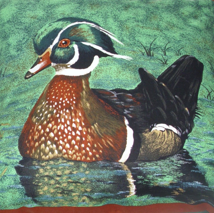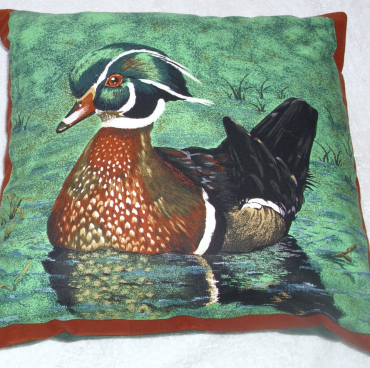 A lovely cushion of a Wood duck paddling peacefully , lovely and soft cushion, would look good in any lounge, sitting room, study or office on any settee or armchair or in a conservatory or summer house or on a bed.
