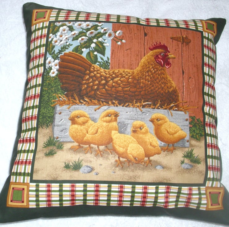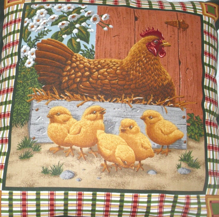 A square cushion with a Chicken in a crate with her five fluffy golden chicks on the ground in front of her. would look good in any lounge, sitting room, study or office on any settee or armchair or in a conservatory or summer house or on a bed.