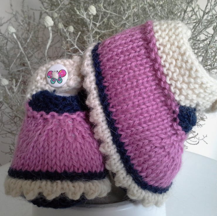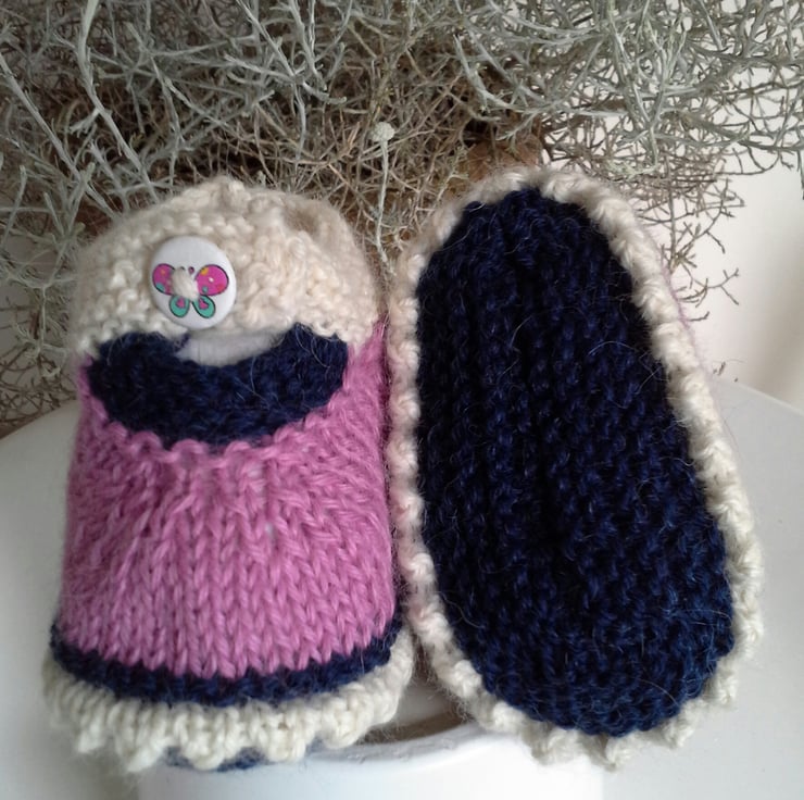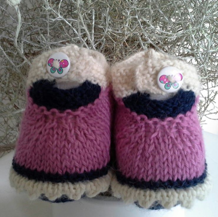A sweet practical warm pair of baby girl's knitted shoes designed and created using designer branded pure baby alpaca yarns. Each shoe fastens with a genuine wooden button with a delicate butterfly design on them.