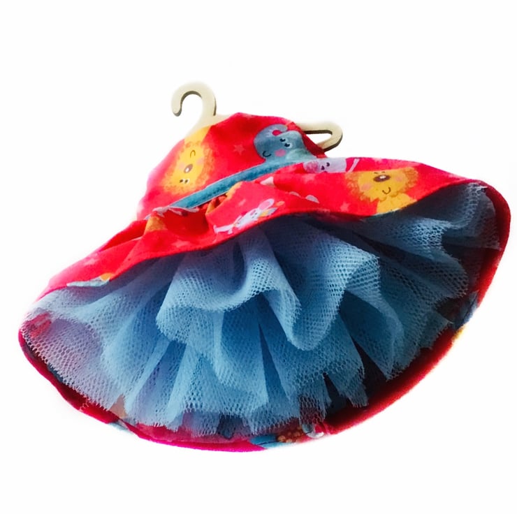 A cute little circus print dress with a puffball underskirt to fit the Mulberry Green characters.The dress is bright red and is covered in little circus animals and the underskirt is made from 4 layers of pale blue net to make the skirt stick out. It comes with a cute little wooden hanger.