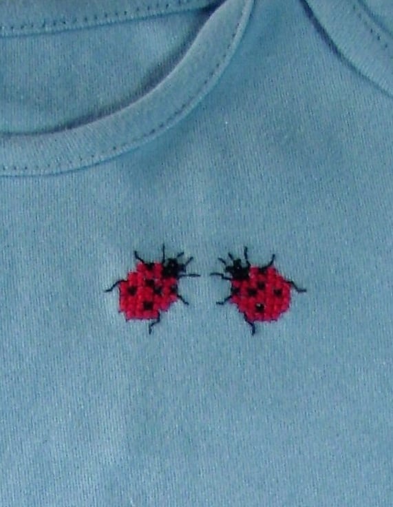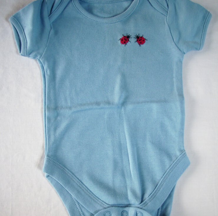 This is a light blue baby vest by Tu. I have hand stitched two scarlet ladybirds on the front, facing each other as though chatting. As I never use a permanent backing material when hand embroidering kids' clothing, there is nothing inside to irritate your child's skin. The vest has an envelope neck, short sleeves and three press studs between the leg openings. It is 100% cotton and is machine washable.