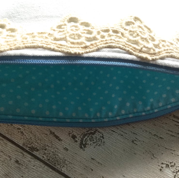 A pale blue cotton fabric has been used for the lining with a classic white spot design and fleece interfacing gives the piece softness and structure.