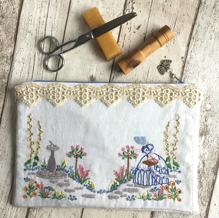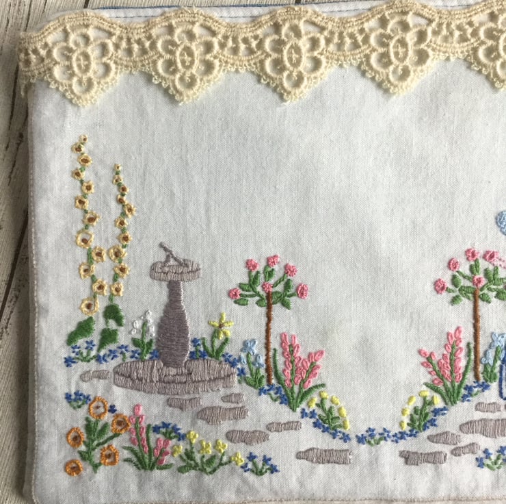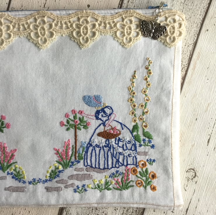 This vintage tray cloth in a white linen has been upcycled into a pretty zipped bag. This delightful hand embroidered scene of a crinoline lady with sunhat and basket is picking pink roses in a summer garden on a path leading to a sundial. This is no fine embroidery but has a real 1950s feel to it, though it is not dated and the bright colours make you almost feel the warmth of the sun on this little scene. The colours are still bright and vibrant so I do not think this has had much use or been in the day light much.