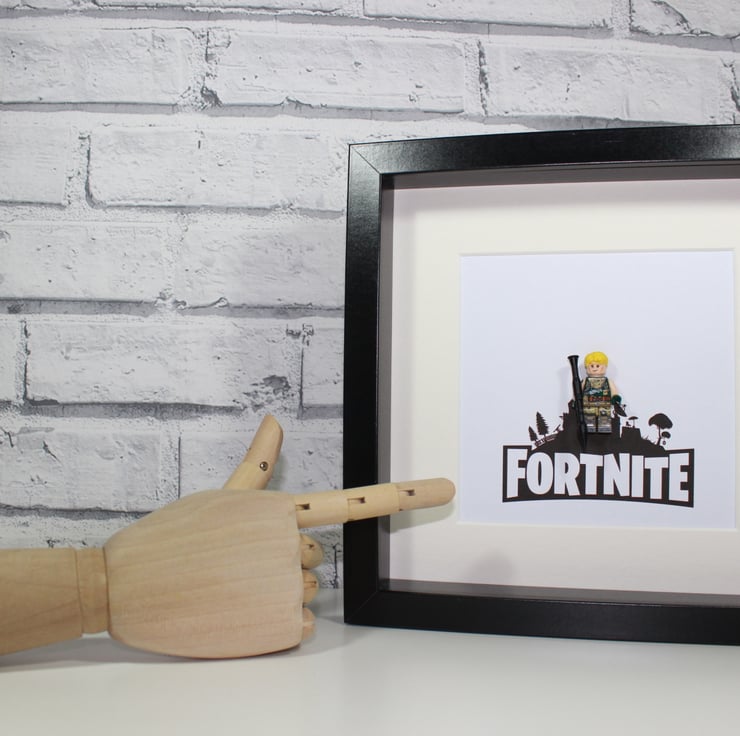 We present our tribute to one of the biggest video games of the century - Fortnite. We have mounted a custom minifigure in to a deep box frame and teamed him alongside with a printed logo underneath.