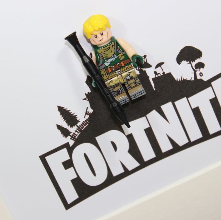 We present our tribute to one of the biggest video games of the century - Fortnite. We have mounted a custom minifigure in to a deep box frame and teamed him alongside with a printed logo underneath.