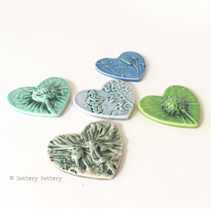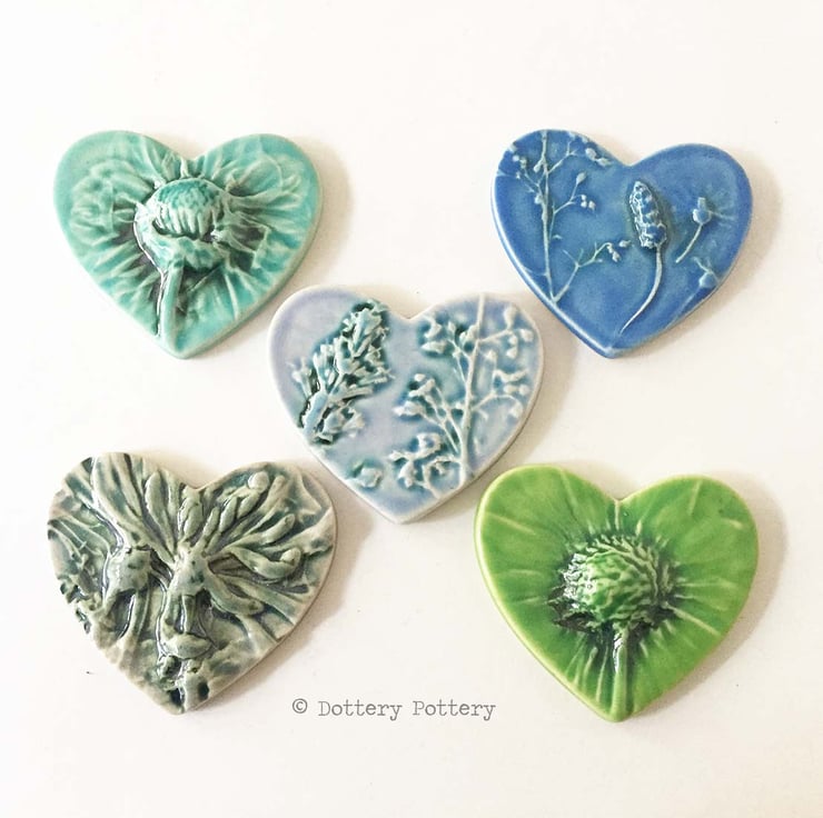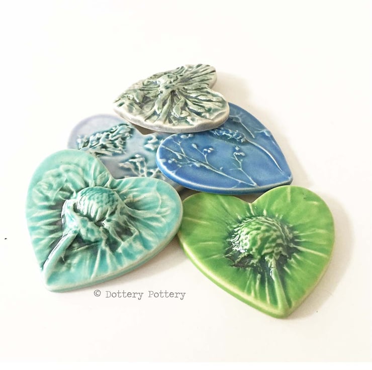 This set of five little ceramic tiles are made from white earthenware clay and fired to a top temperature of 1100 degrees. They have been imprinted with natural flower designs and finished in lovely, shiny glazes in shades of blue green and purple. Would be suitable to frame or use for other craft projects Each tile measures 5.5cm x 6cm x up to 1.2 cm deep. was £20 now £14